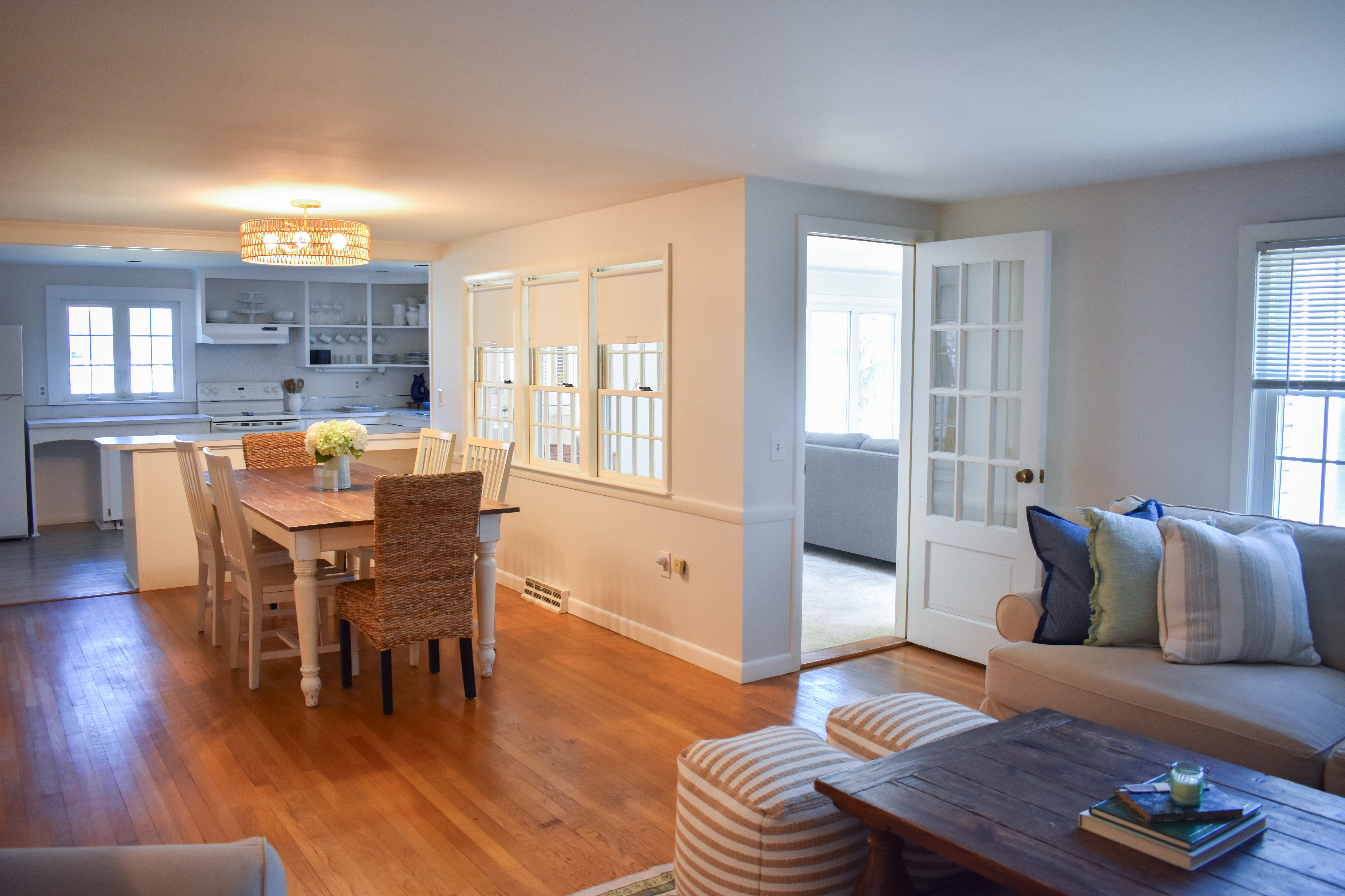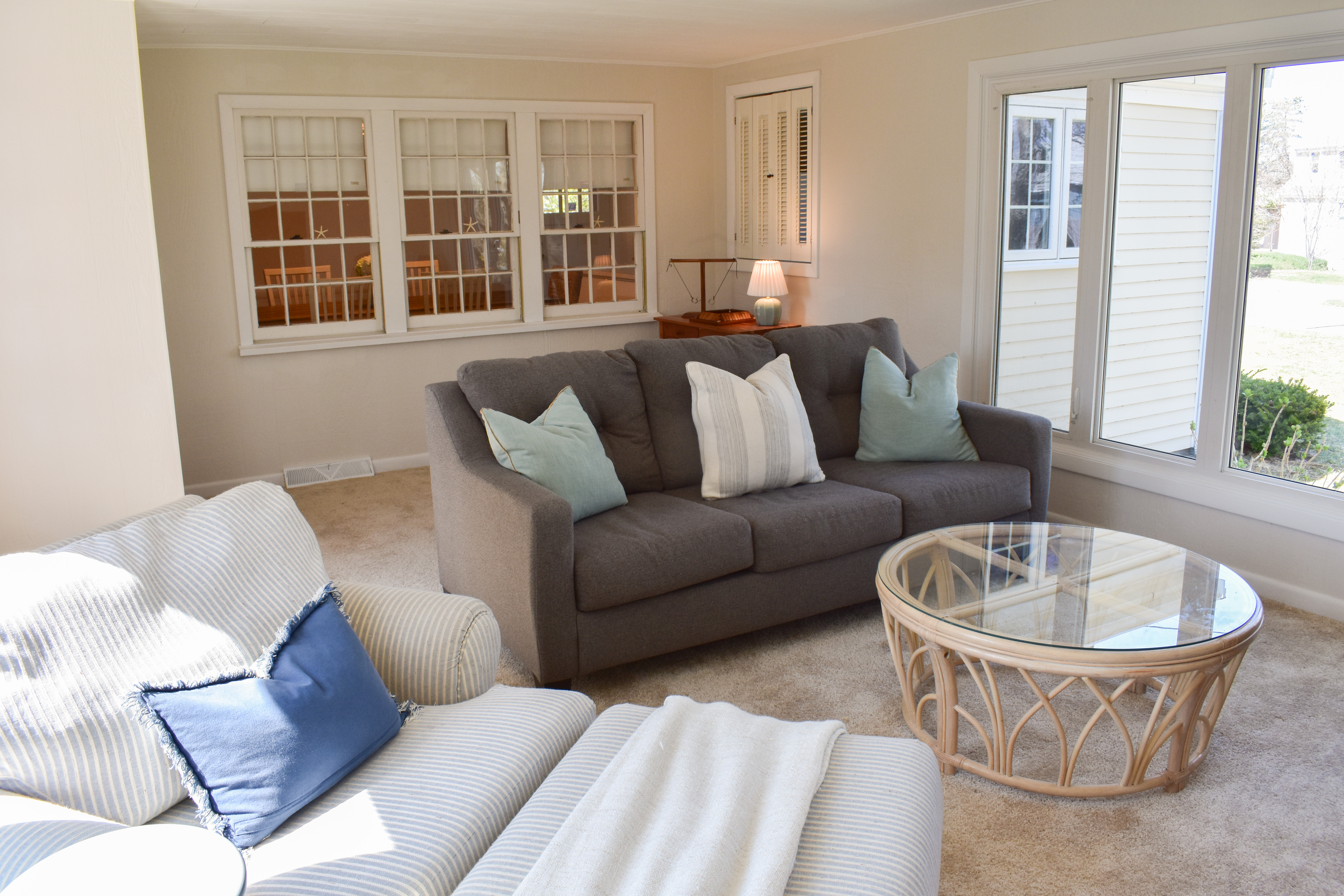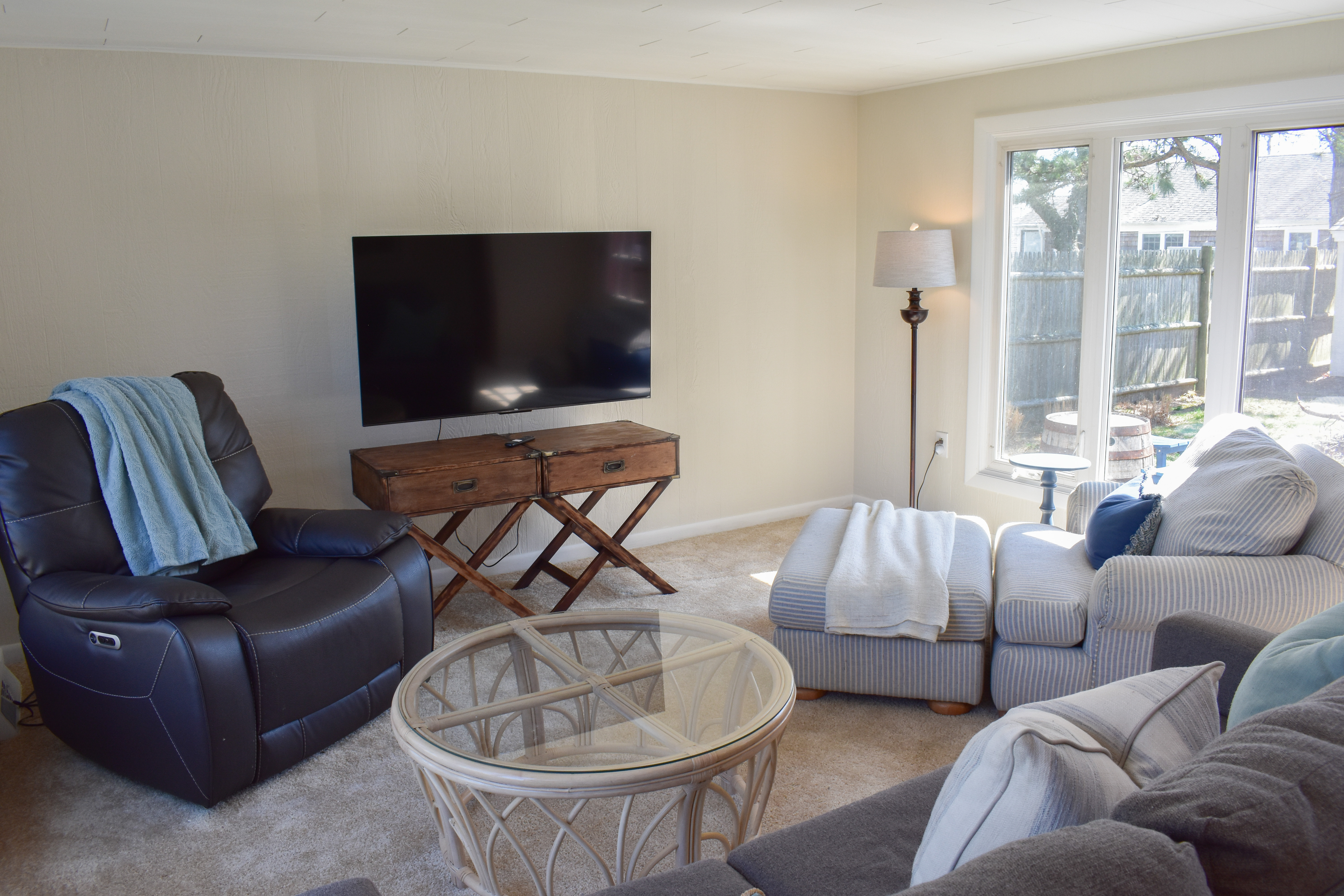 Designed with bright, airy decor throughout, this home sets the perfect tone for your getaway. As you enter, you’ll immediately notice the spacious layout. The fully equipped kitchen opens into a sun-filled dining area, perfect for meals and gathering. The living room offers cozy seating, ideal for lounging and relaxing, and flows seamlessly into the sunroom, where you'll find additional seating and a TV offering streaming services. The sunroom sofa converts into a full-size sleeper for your convenience. Down the hall, you'll find three inviting bedrooms, each thoughtfully decorated with coastal accents, as well as a full bath with a stand-up shower. The master bedroom and living room will be equipped with window air conditioning.